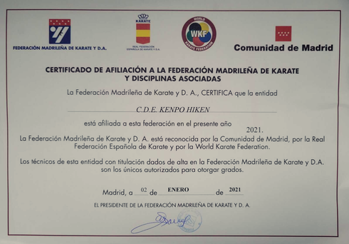 Estamos inscritos en el Registro de Entidades Deportivas de la Comunidad de Madrid con el número 6.109. Así mismo, estamos federados en la Federación Madrileña de Kárate, en el Departamento Nacional de Kenpo.